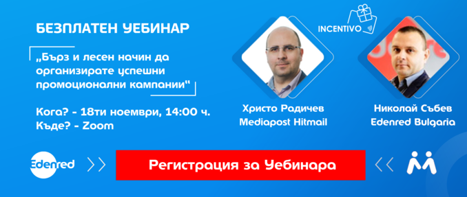 Inscrivez-vous pour le webinaire gratuit organisé par nos membres Edenred Bulgaria et MediaPost Hit Mail sur le thème : « Un moyen rapide et facile d'organiser des campagnes publicitaires réussies ».