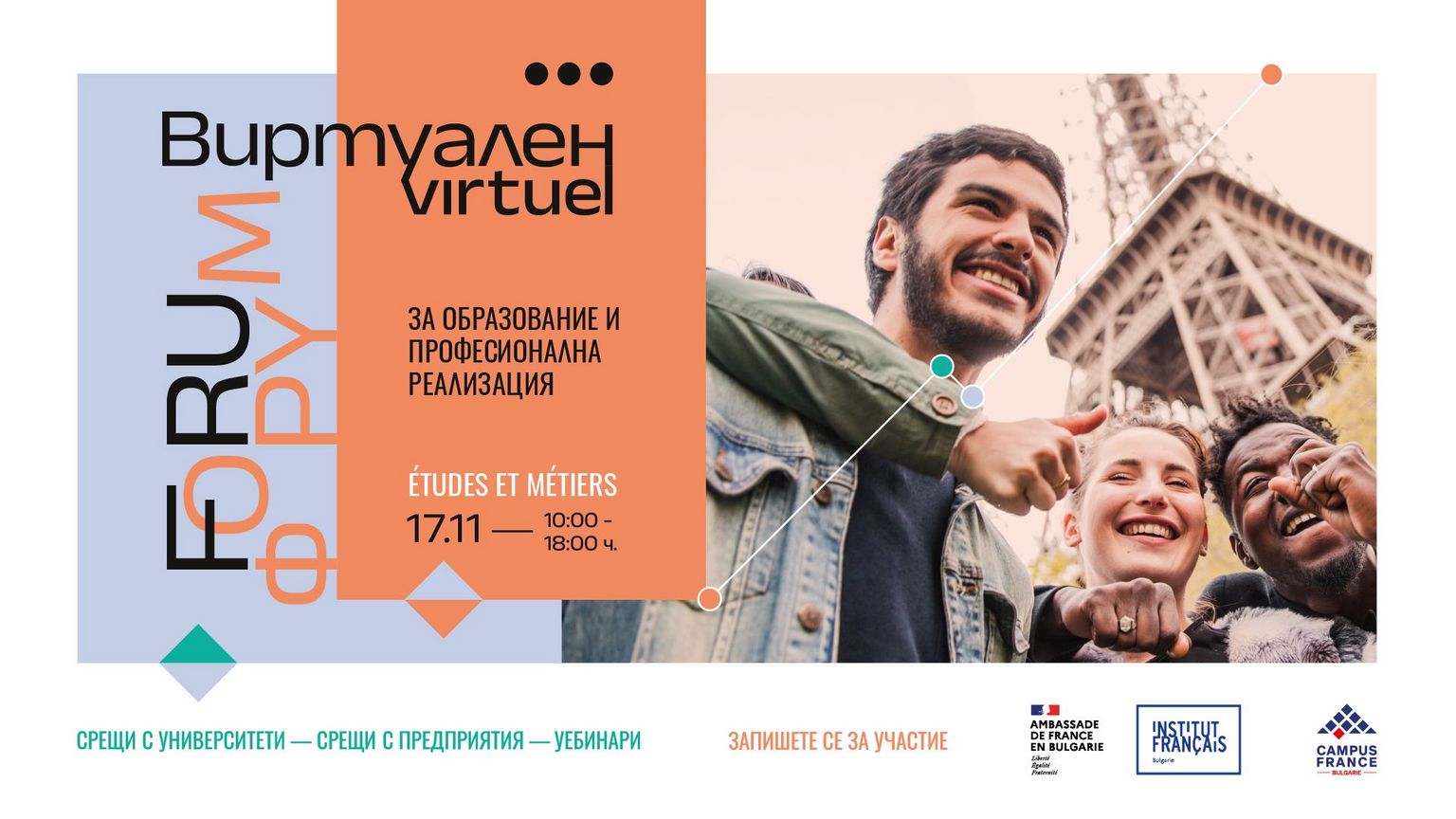 L’Institut français de Bulgarie et l’Agence Campus France ont le plaisir de vous inviter le 17 novembre 2023 au « Forum virtuel des études et des métiers ».