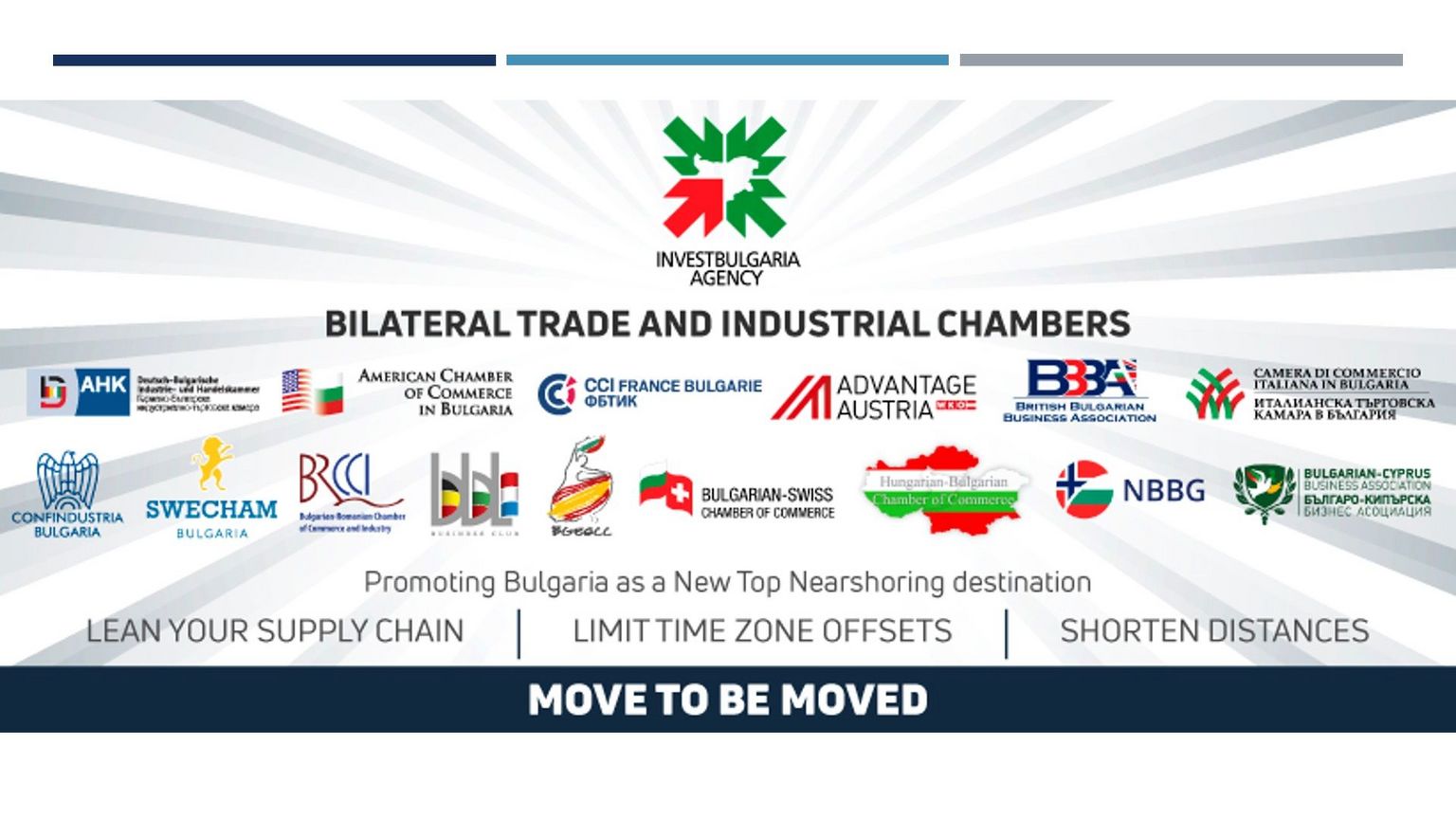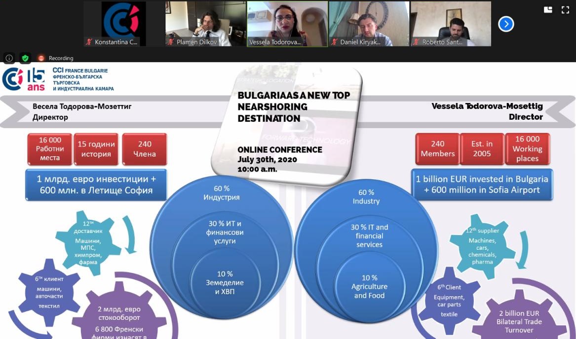 La Chambre de commerce et d'industrie Franco-Bulgare (CCIFB) est heureuse d'initier et de participer à la campagne qui vise à présenter la Bulgarie comme une nouvelle destination de « nearshoring » dans le monde. L'initiative, un travail conjoint de l'Agence bulgare d'investissements et de quinze chambres bilatérales de commerce et d'industrie, a commencé hier avec la première d'une série de vidéoconférences avec la participation du Vice-Ministre de l'Economie Monsieur Stamen Yanev, ainsi que les directions des Chambres bilatérales et leurs membres.