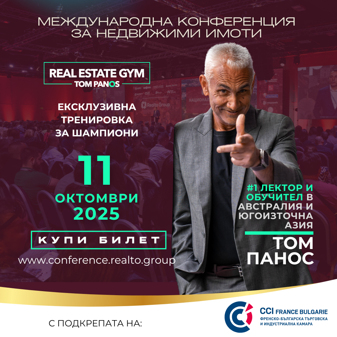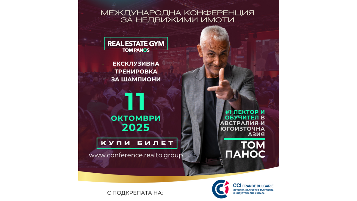Международна конференция Realto Group, най-мащабното събитие в сектора на недвижимите имоти в България, ще се проведе на 11 октомври 2025 г. в Sofia Event Center в гр. София. Специален гост е Том Панос – световно признат лектор и създател на програмата Real Estate Gym, която обучава елитния 1% от най-успешните брокери и бизнес лидери. Неговите методи за висока продуктивност, вдъхновение и изграждане на устойчив бизнес са приложими не само в недвижимите имоти, но и във всяка динамична индустрия – от технологии и финанси до маркетинг и управление на хора.