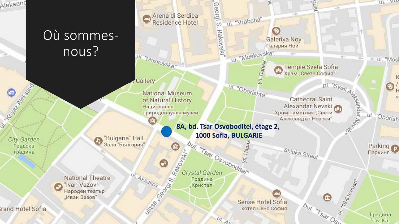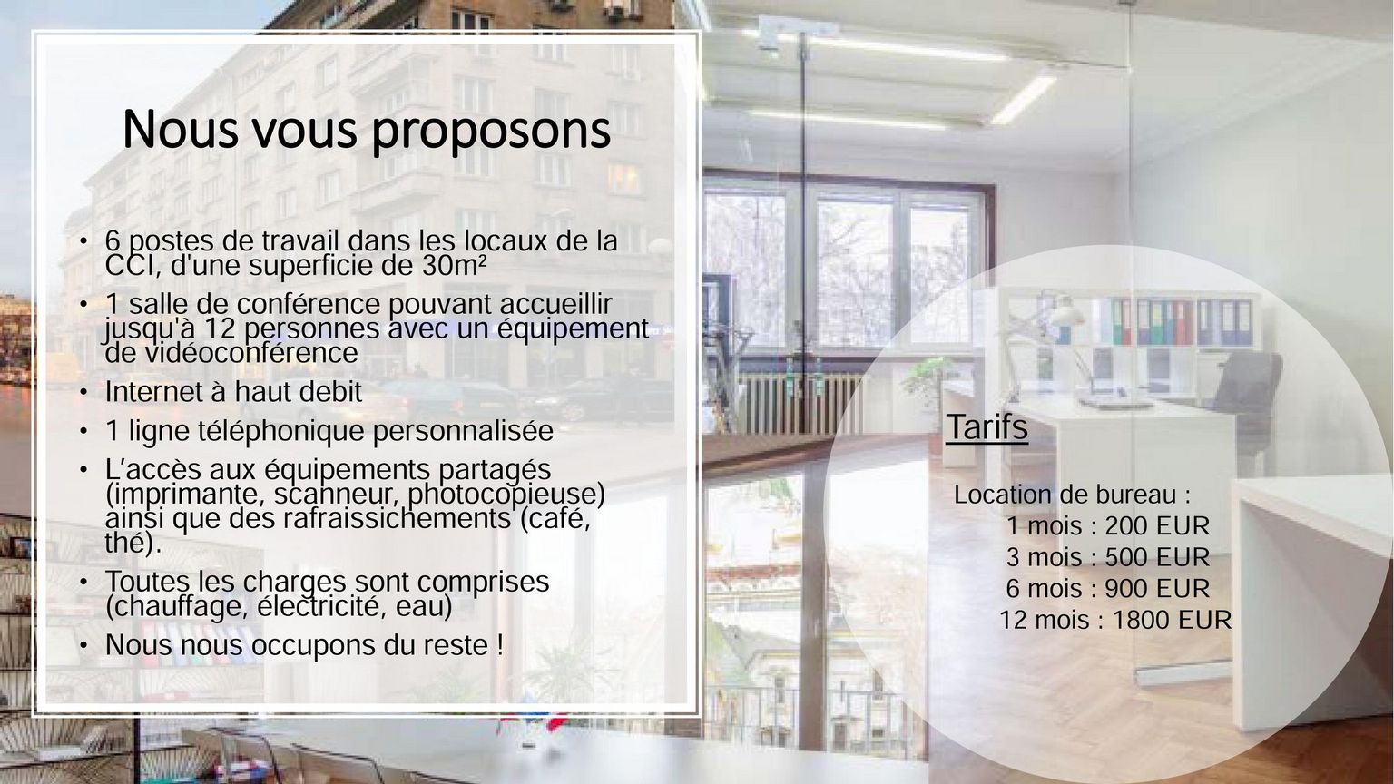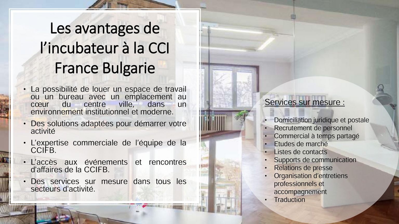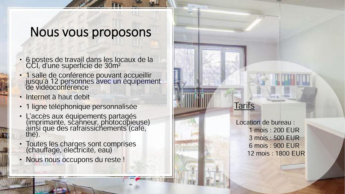 Vous souhaitez lancer votre activité rapidement et vous avez besoin d’un bureau équipé en centre-ville ? Vous souhaitez tester le potentiel de votre société en Bulgarie, sans vous engager à long terme ? Vous souhaitez bénéficier de notre réseau, de nos connaissances de l’environnement économique en Bulgarie, de nos contacts auprès des administrations et des entreprises bulgares ou de notre vivier de talents ? Vos locaux ne sont pas dans la capitale, mais vous vous y déplacez régulièrement et vous avez besoin d’un bureau de passage et/ou d’une salle de réunion dans un bâtiment de standing ? La CCIFB vous propose bien plus qu’un bureau : vous accéderez à un accélérateur de croissance pour votre société et à un espace de travail fonctionnel.