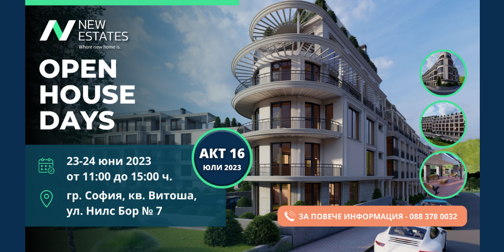 Welcome to "Open House Days" on June 23 and 24, 2023 in an elegant residential complex in the Vitosha district. Our professional consultants will present you your dream home, where you will enjoy peace, silence and a picturesque view of Vitosha and the city.