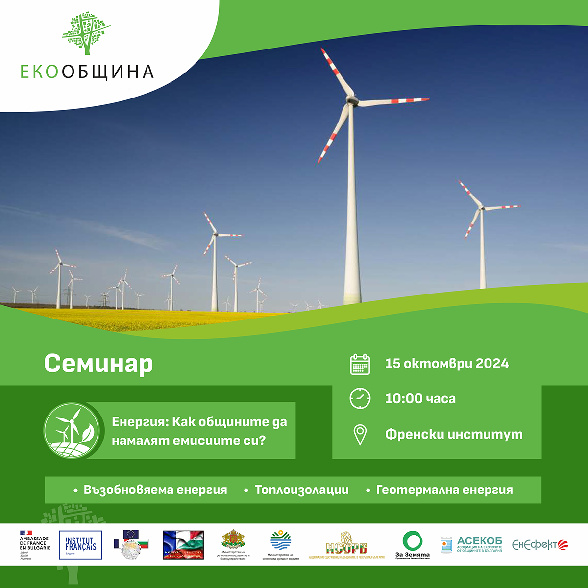 Nous avons le plaisir de vous inviter à notre deuxième séminaire ECOOBSHTINA (ville durable), qui aura lieu le 15 octobre, de 10h00 à 13h30, à l'Institut français de Bulgarie, en présence de maires français et bulgares, de représentants de ministères et d'experts dans le domaine de l'efficacité énergétique.