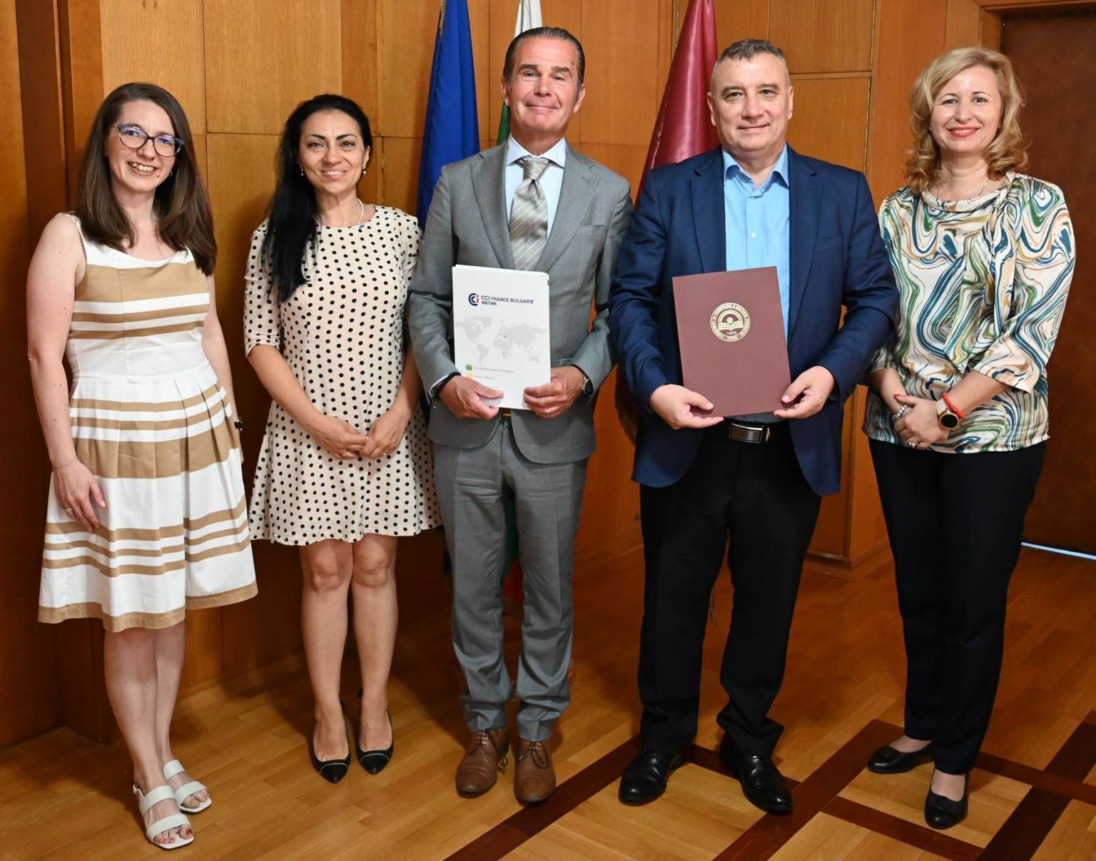 L'accord a été signé par Monsieur Stéphane Delahaye, Président de la CCIFB et le Prof. Docteur Dimitri Dimitrov, recteur de l'université. Étaient présentes à la cérémonie de signature également la Prof. Docteure Tsvetana Stoyanova, Vice-rectrice en charge de la coopération avec les institutions, Mme Desislava Paunska en charge des relations publiques de l'université et Mme Vessela Mosettig, Directrice de la CCIFB, la chercheuse associée docteure Liliana Mihova, qui seront en charge de l'exécution opérationnelle de l'accord. L'Université d'économie nationale et mondiale accueille 20 000 étudiants et a formé plusieurs dizaines d'hommes et de femmes d'Etat : premier(e)s ministres, ministres, chefs de la Banque centrale, une commissaire européenne, une directrice générale du FMI et une directrice générale de l'Unesco.