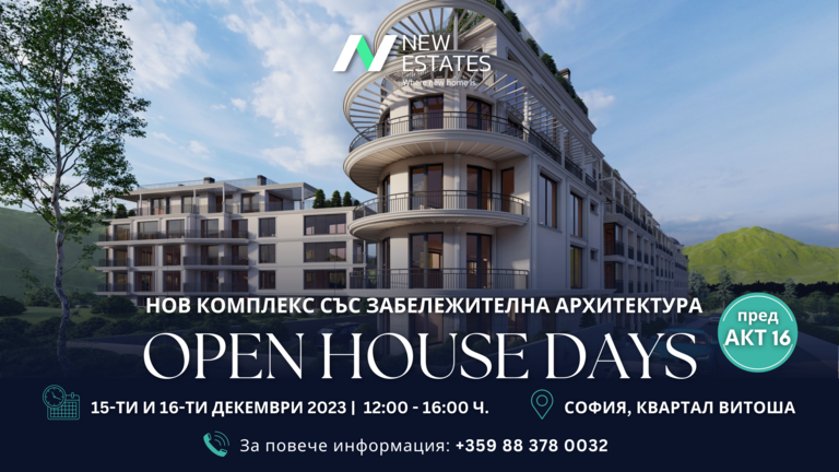 New Estates invites you to Open House Days on December 15th and 16th /Friday and Saturday/ from 12:00 to 16:00 in a new complex in front of Act 16 in…