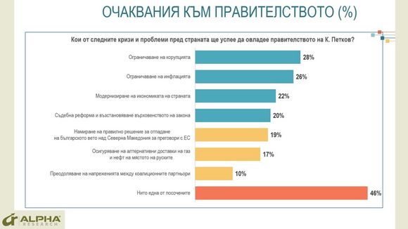 - Във вътрешнополитически план: рязък спад на доверието към правителството, премиера и управляващото мнозинство, задълбочил се още повече след публичните раздори между коалиционните партньори. Преобладаващо песимистични очаквания, че кабинетът ще успее да овладее текущите кризи; кредит на доверие в борбата с корупцията и съдебната реформа.