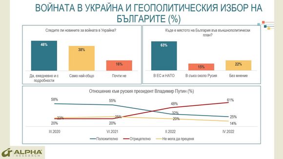 - Във външнополитически аспект: изострено внимание към войната в Украйна, нарастващо неодобрение за руския президент В. Путин и обществен консенсус за евроатлантическата политическа ориентация на страната.