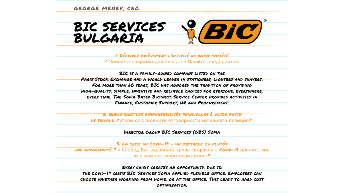 #CCIFBMembresDePrès има удоволствието да ви представи главния директор Георги Менев на нашия член BIC Services Sofia, световен лидер в производството на химикалки, запалки и самобръсначки. Създадена преди 75 години, компанията продава своите продукти в над 160 страни по целия свят. Центърът за споделени услуги на BIC отвори вртаи в София през октомври 2020 и оттогава разширява своите екипи в сферата на финансите, финансовите анализи, човешките ресурси, обслужване клиенти, корпоративни дейности.