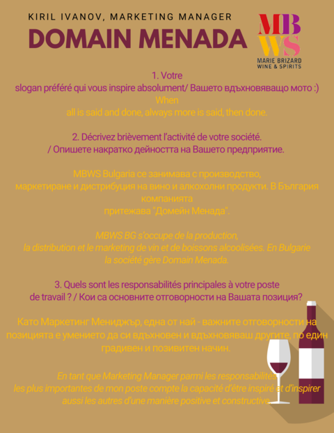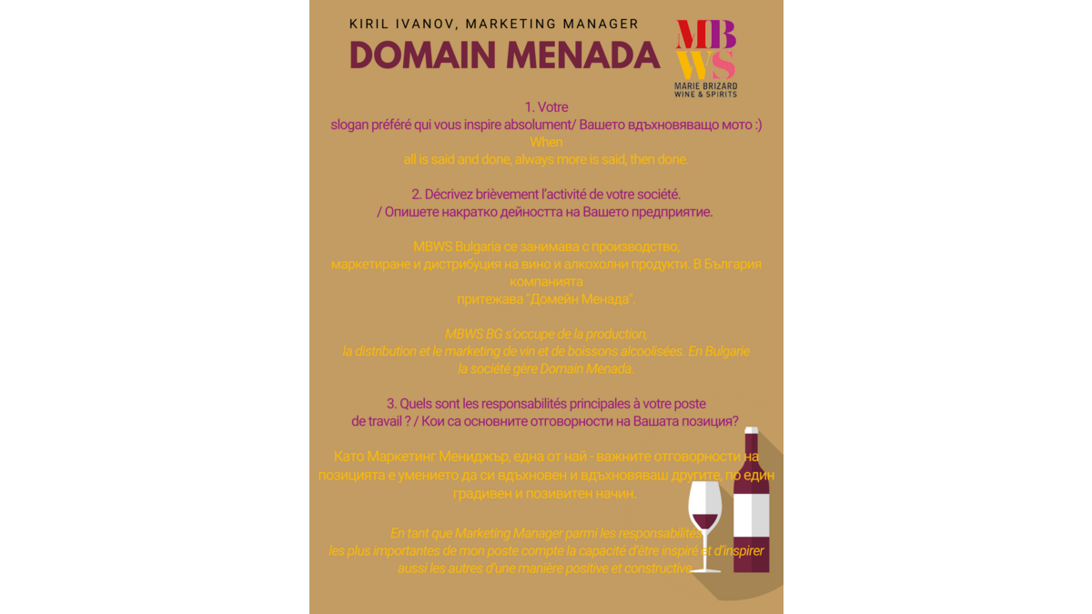 #CCIFBMembresDePrès има удоволствието да ви представи нашия член Domain Menada (Marie Brizard Wine & Spirits Group Bulgaria), който се занимава с производство, дистрибуция и маркетинг на вино и алкохолни напитки. Кирил Иванов, директор „маркетинг“ на компанията, обобщава основните предизвикателства пред мениджърите на маркетинг отдел.