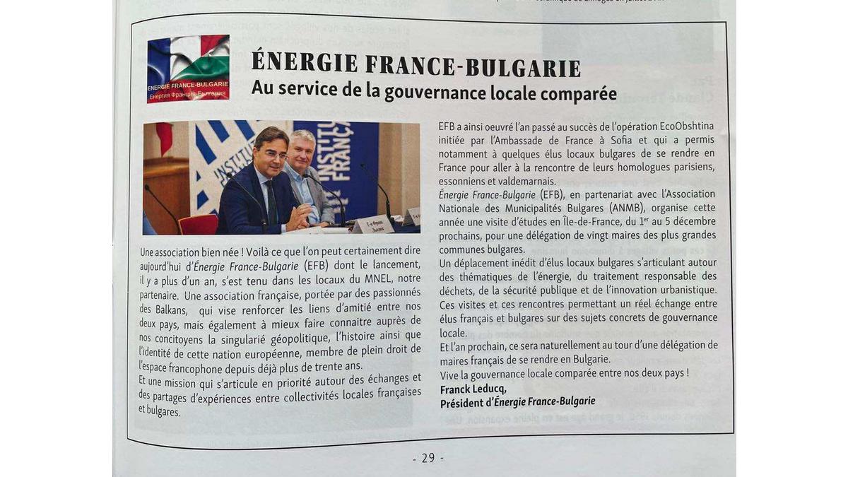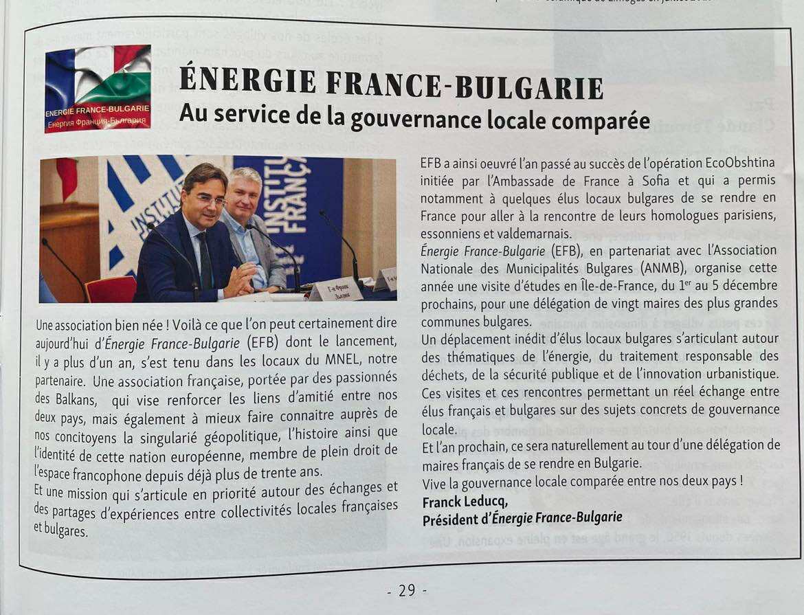 Нашият партньор Énergie France Bulgarie присъства в последния брой на списание L’élu local, където представят своя ангажимент в подкрепа на сравнителното местно управление.