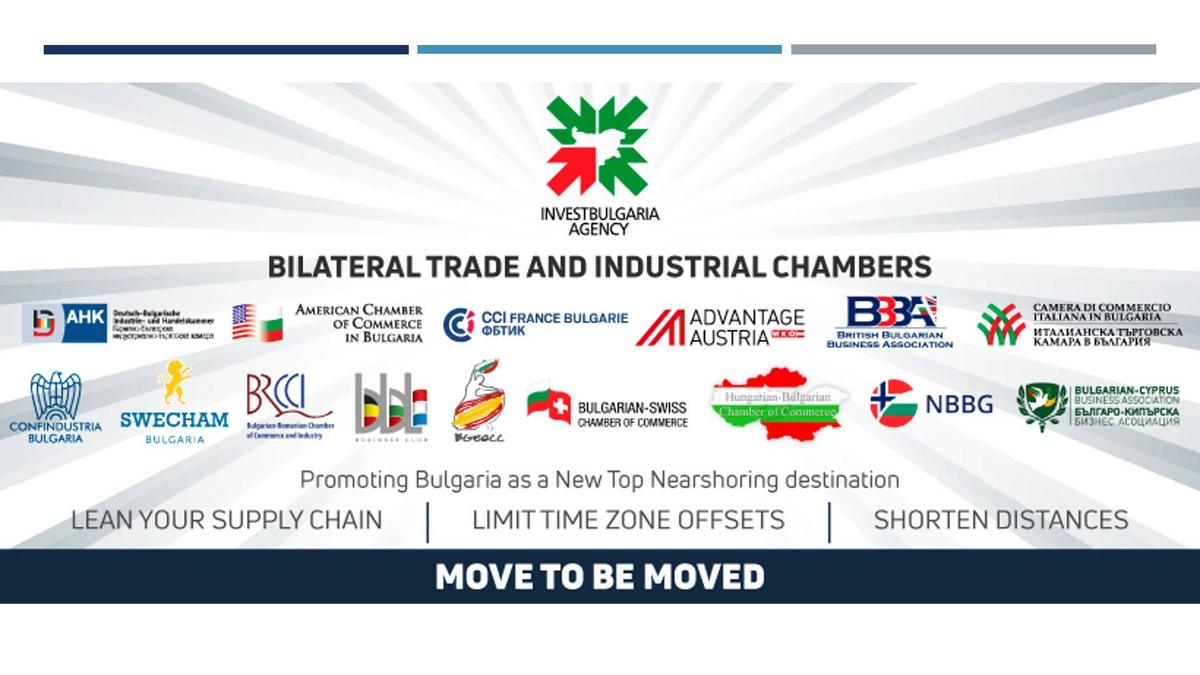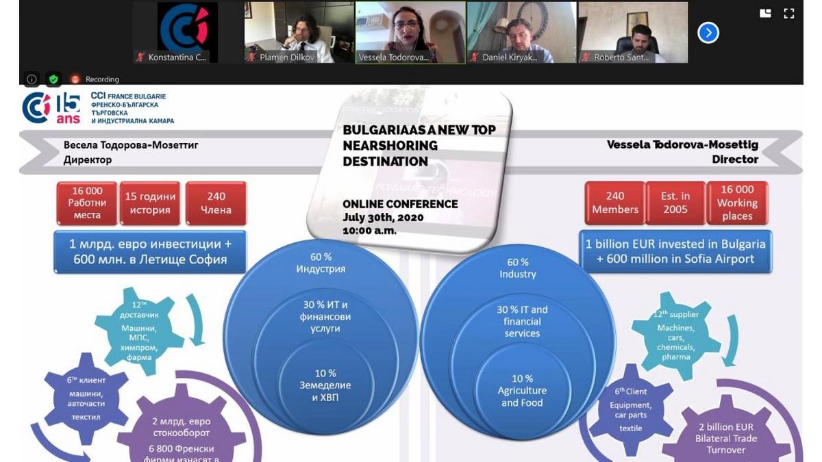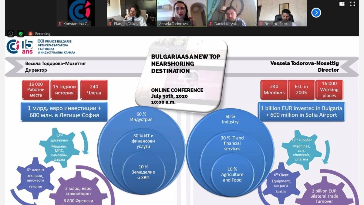 Френско-българската търговска и индустриална камара (ФБТИК) има радостта да бъде инициатор и част от кампанията за представяне на България като нова „nearshoring“ дестинация в световен мащаб. Инициативата, съвместно дело на Българска агенция за инвестиции /БАИ/ и петнадесет Двустранни търговски и индустриални камари, стартира вчера с първата от серията видеоконференции с участието на зам. министъра на икономиката господин Стамен Янев, както и ръководствата на Двустранните търговски и индустриални камари с техните членове.