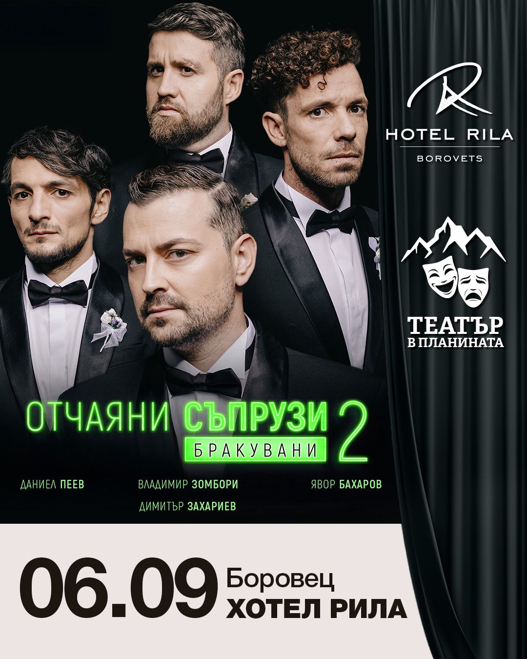 „Отчаяни съпрузи 2: Бракувани“ е част от втория сезон на нашата културна инициатива „Театър в планината“, която съчетава красотата на Рила планина и най-доброто от българската театрална сцена.