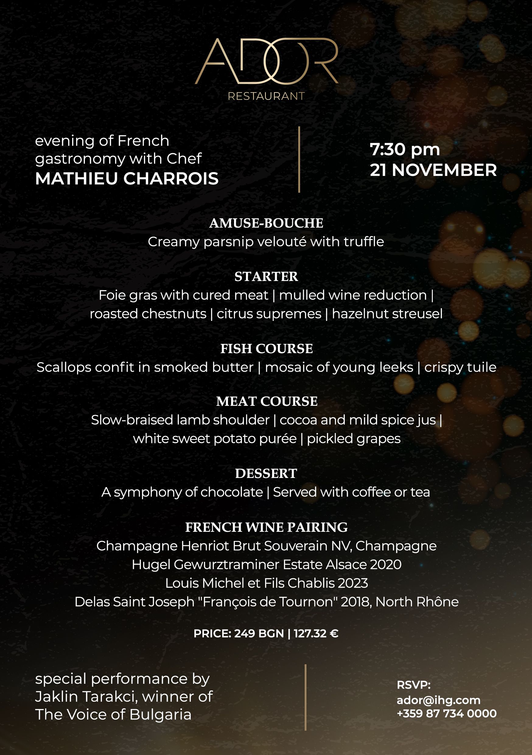 The dinner will be accompanied by a finely selected pairing of French wines and champagne, while Jaklin Tarakci, winner of The Voice of Bulgaria, will take you on a musical journey to France.