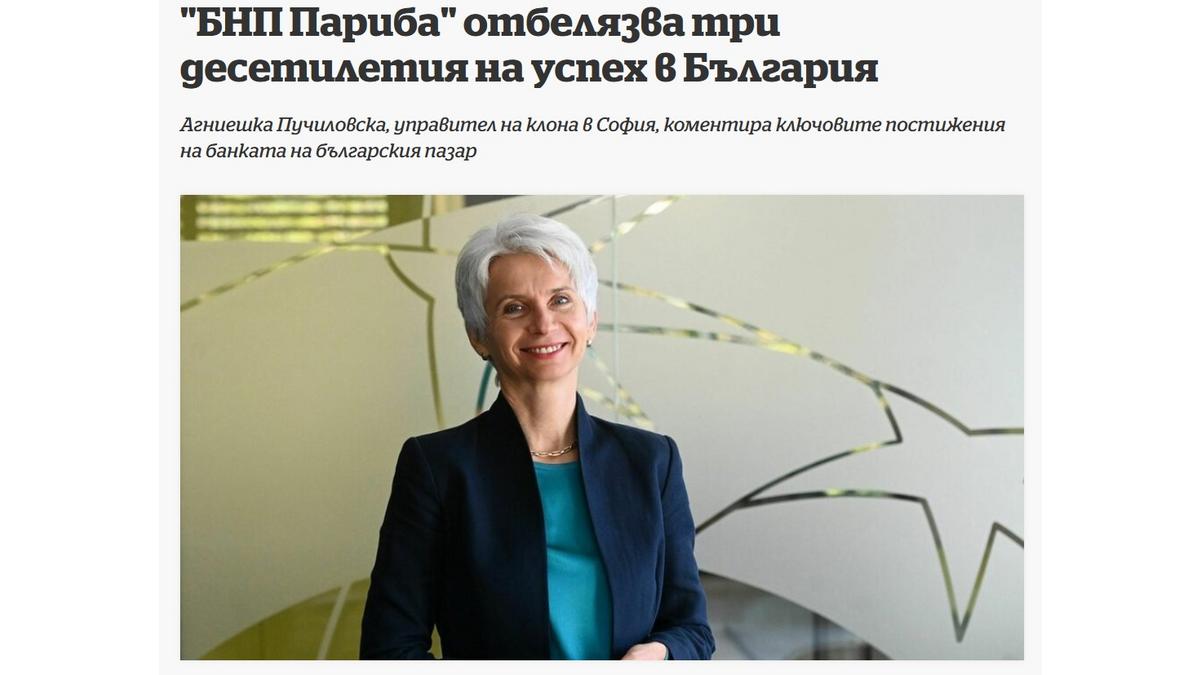 Интервю на госпожа Агниешка Пучиловска, управител на БНП Париба в София, по повод 30-годишнината на банката на българския пазар