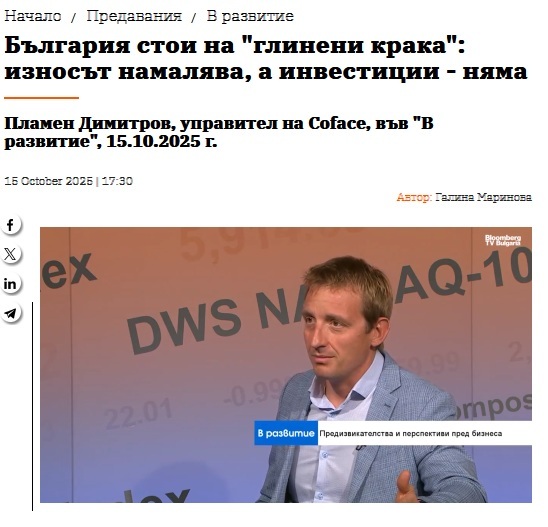 Цялото интервю на Пламен Димитров, управител на Coface, в предаването "В развитие" на Bloomberg TV Bulgaria, можете да прочетете отдолу:
