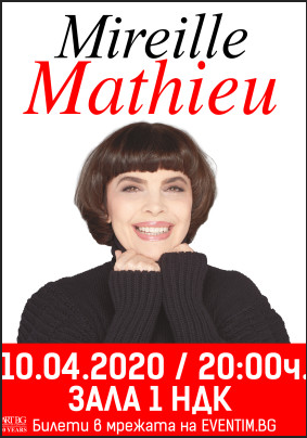 Можете да се възплзвате от специални пакетни цениа за концерта на френската звезда Mireille Mathieu на 1а април 2020 г. в зала 1 на Националния дворец на културата.