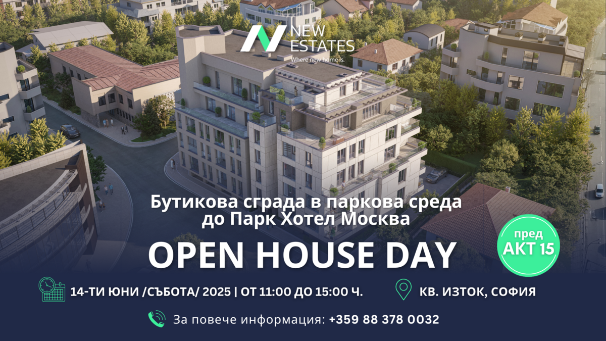 New Estates invites you to an Open House Day on Saturday, June 14, from 11:00 AM to 3:00 PM in the Iztok district, where we will present a prestigious boutique building nearing completion (Act 15). The strategic location, right next to Borisova Garden and Park Hotel Moskva, offers easy access to the city center, a metro station, and key transport links.