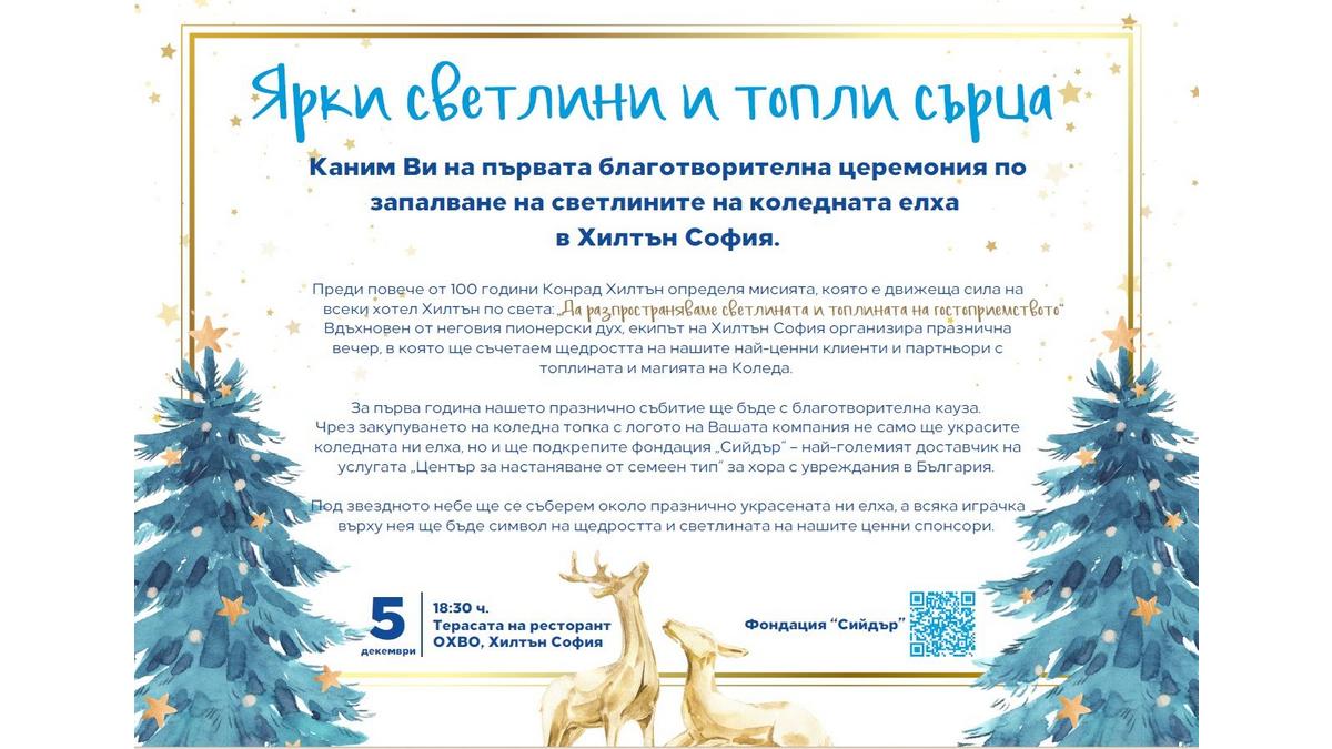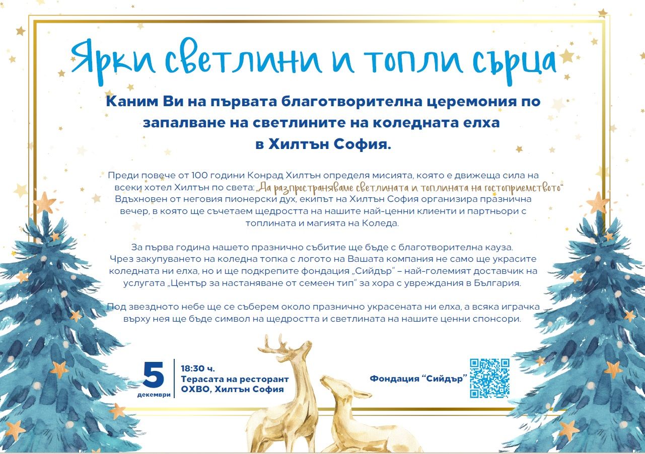 И защото вярваме, че доброто и Коледа вървят ръка за ръка, тази година събитието ще бъде с изцяло благотворителна насоченост в партньорство с фондация "Сийдър". Ако желаете да се включите като спонсор, в прикачения файл можете да откриете поканата за събитието на стр. 1 и цялата необходима информация и начинa, по който можете да подкрепите фондация "Сийдър" на стр.2.