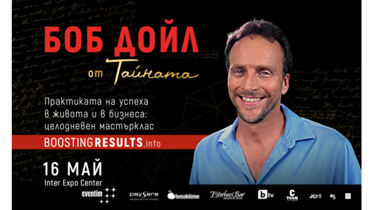 Участвайте за пръв път на живо в мастъркласа на Боб Дойл - един консултантите във филма - феномен „Тайната“ и автор на книгите „Следвай страстта си“ и „Богатство отвъд разума“. Заповядайте на 16 май на семинара „Как да ускорим резултатите чрез Закона на Привличането в професионален и личен план“, където ще научим как да превръщаме мечтите си в цели. Информация за събитието е публикувана на специално създадения сайт: http://www.boostingresults.info/