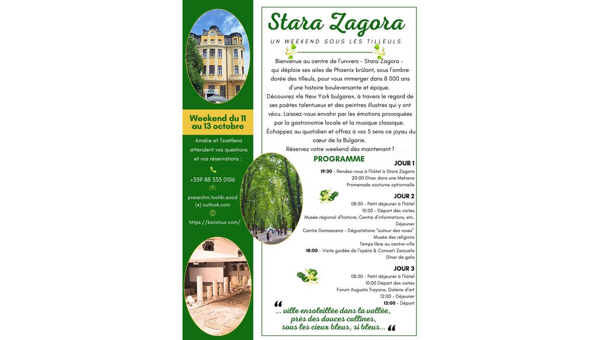 Информация ще намерите на https://karistour.com/fr/2024/07/09/stara-zagora-un-weekend-sous-les-tilleuls/ и по имейл :presechni.tochki.eood@outlook.com