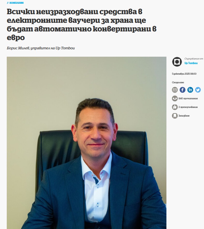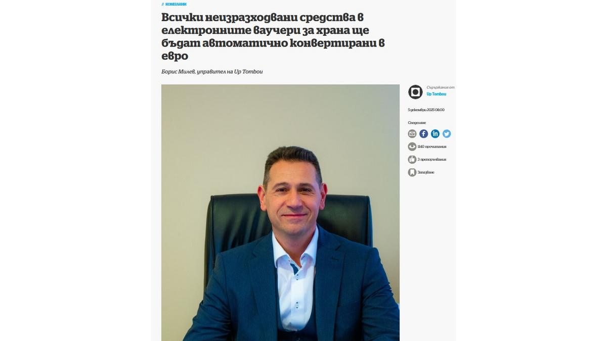 Интервю на Борис Милев, управител на Up Tombou, относно електронните ваучери за храна след въвеждането на еврото в България: