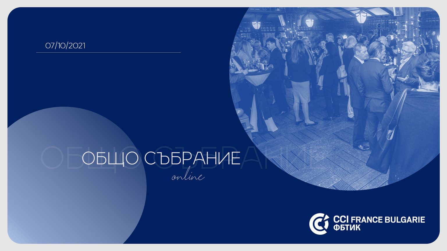 Управителният съвет на Френско-българска търговска и индустриална камара Ви съобщава, че свиква Годишно общо събрание на асоциацията на 7 октомври 2021 г. от 17:30 ч., както това бе надлежно обявено в Държавен вестник. С оглед санитарните мерки, въведени от правителството до 30 октомври, тазгодишното събрание ще се състои под формата на видеоконферентна среща в платформата Zoom. Линкът, както и детайлите за регистрация са изпратени на управителите на компаниите-членове на 24 септември 2021 г. (проверете папка спам).