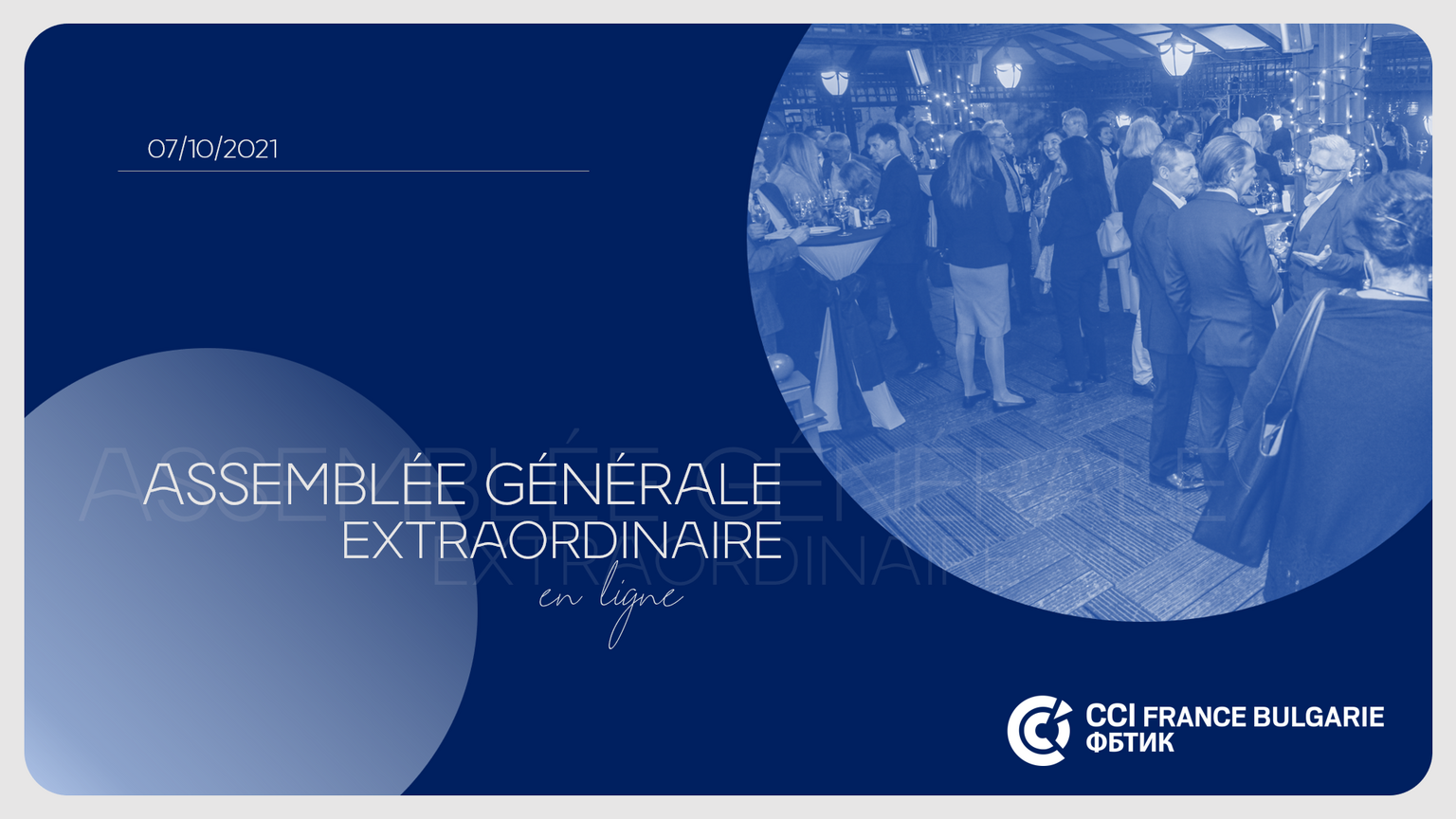 Le Conseil d’administration de Chambre de commerce et d’industrie France Bulgarie vous informe qu’il convoque l’Assemblée générale extraordinaire de l’Association le 7 octobre 2021 à 17h30, comme ceci a été dûment publié au JO. En raison des mesures sanitaires introduites par le gouvernement jusqu’au 30 octobre, l'AG de cette année se tiendra sous la forme d’une réunion par visioconférence sur le dispositif Zoom. Nous avons envoyé le lien et les détails d'inscription au PDG de chaque entreprise-membre le 24 septembre 2021 (vérifiez le dossier spam).