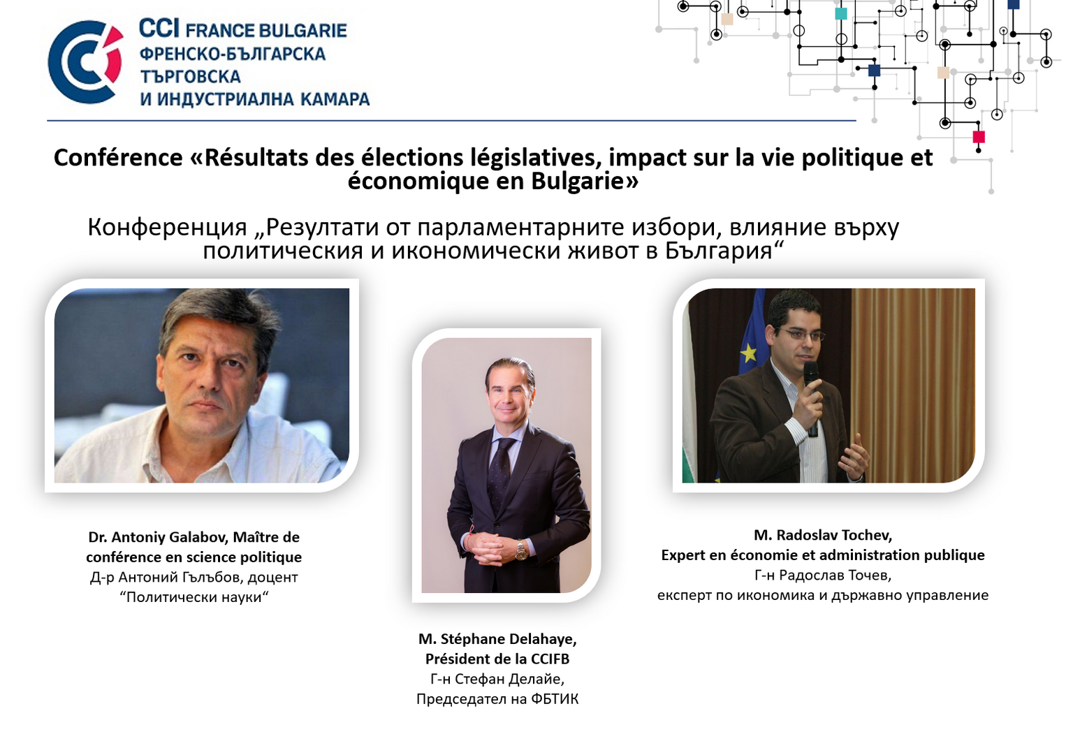 La Chambre de commerce et d’industrie France Bulgarie a le plaisir de vous inviter à une conférence d’analyse et débriefing des résultats électoraux et des perspectives politiques et économiques devant la Bulgarie:
