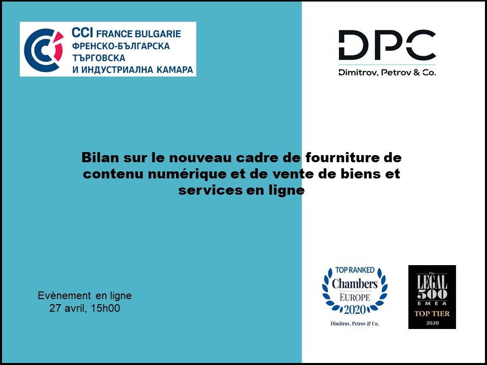 La CCI France Bulgarie et le cabinet d’avocats membre Dimitrov, Petrov&Co. ont le plaisir de vous inviter à un webinaire sur le sujet « Bilan sur le nouveau cadre de fourniture de contenu numérique et de vente de biens et services en ligne» qui se tiendra en ligne le 27 avril 2021 à 11 heures.