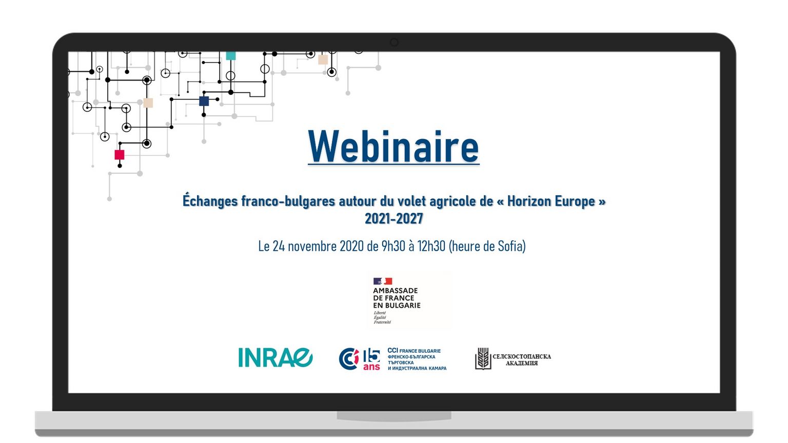 L’ambassade de France en Bulgarie, avec l’aimable soutien de l’Académie agricole de Bulgarie et la Chambre de Commerce France-Bulgarie, vous invite à suivre un webinaire avec la participation de l’Institut National de Recherche pour l’Agriculture, l’Alimentation et l’Environnement (INRAE) pour une présentation, suivie d’une discussion avec des représentants bulgares du monde de la recherche, des entreprises et des administrations, autour du volet agricole du prochain programme européen de Recherche et d’Innovation « Horizon Europe » 2021-2027.